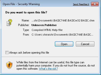 Then the following dialog appears. Remove the check on "Always ask before opening this file", and then click "Open".