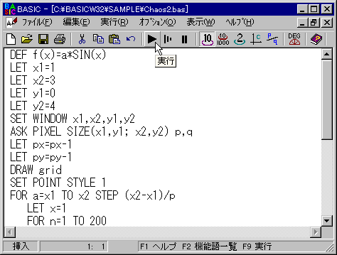 プログラムの実行は簡単です。プログラムを打ち込み,実行のボタンをクリックするだけです。