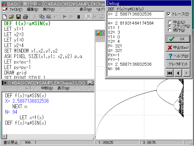 言語によるデバッグ機能(DEBUG ON, BREAK, TRACE ON)のほかに,GUIによるデバッグ機能を用意しています。