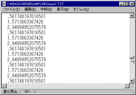 図形出力ウィンドウの下部には最後に実行したSET WINDOW文にもとづいてマウスカーソル位置の座標値を表示します。