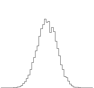 100 DIM A(10 TO 60) 110 MAT A=ZER 120 FOR k=1 TO 10000 130 LET t=0 140 FOR n=1 TO 10 150 LET t=t+INT(RND*6+1) 160 NEXT n 170 LET A(t)=A(t)+1 180 NEXT k 190 SET WINDOW 9,61,0,1000 200 FOR t=10 TO 60 210 PLOT LINES: t-0.5,A(t); t+0.5,A(t); 220 NEXT t 230 END